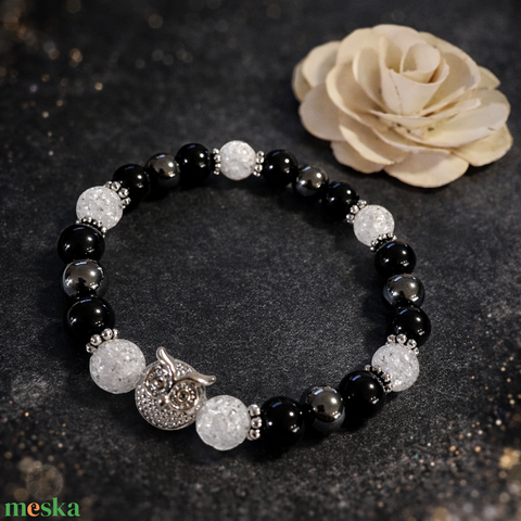 Baglyos ónix,hematit és hegyikristály ásvány karkötő