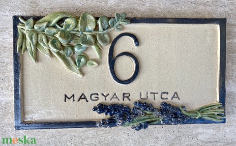 Magyar utca 6 házszámtábla levendulával, eukaliptusz ággal