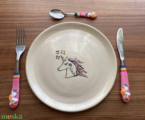 Reggelizős tányér, étkészlet felirattal, rajzzal, evőeszköz készlettel (süthető gyurma evőeszköz vég)
