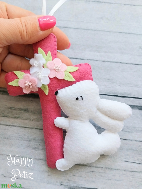 Húsvéti filc feszület, Húsvéti nyuszi dekoráció, keresztény Húsvéti dekor, akasztós nyuszi kereszt dekoráció
