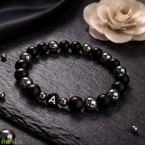 Ónix és hematit ásvány karkötő betűvel