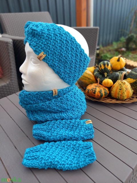 Turkiz kék női szett fülmelegítő, körsál, kézmelegítő
