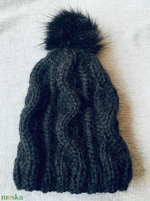 Sapka Kézi kötésű fekete pompom -os csavart mintás női sapka eladó