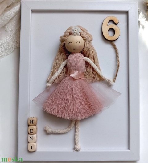 Névreszóló szülinapos makramébaba – bájos kislány képkeretben
