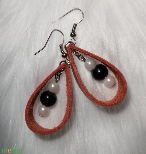 Akrill gyöngyökkel díszített, valódi bőrből készült, csepp alakú fülbevaló