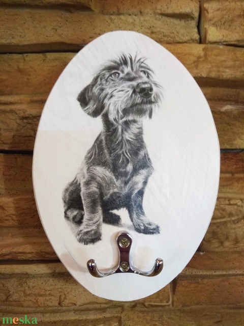 Fali póráz tartó szálkás szőrű tacskó kutyussal