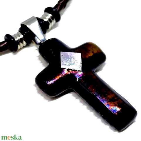 Kereszt barna-ezüstben, üveg medál bőr nyakláncon, nemesacél szerelékkel
