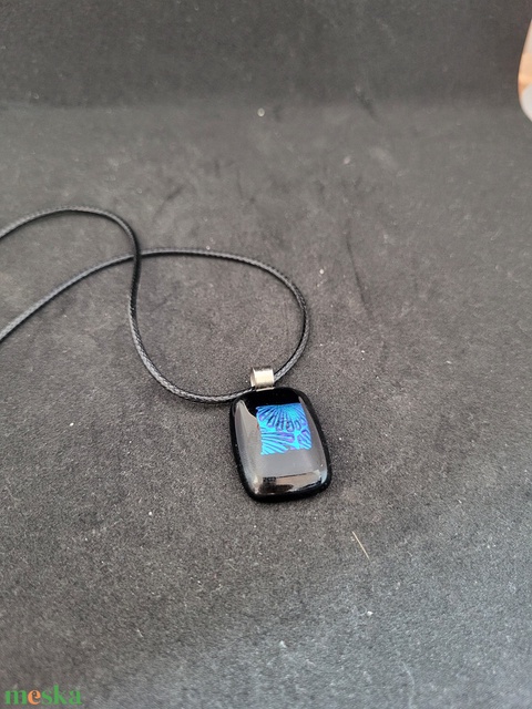 Fekete alapon kék dichroic mintás üveg medál, zsinór nyaklánccal