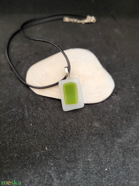 Fehér alapon zöld üveg medál, zsinór nyaklánccal