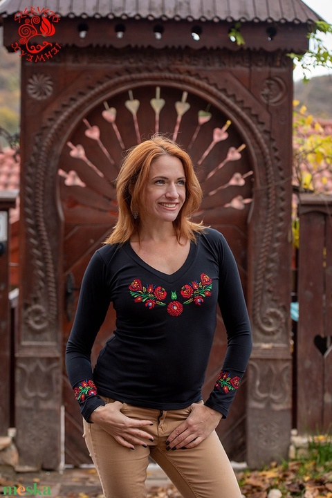 Szervető-matyó motívum-feldolgozással díszített, "V" nyakú, karcsúsított fazonú, hosszú ujjú női póló, színes selyemcérnával hímezve.