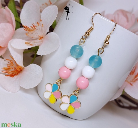 Tarka virág medálos, vidám tavaszi fülbevaló, fém virág medállal