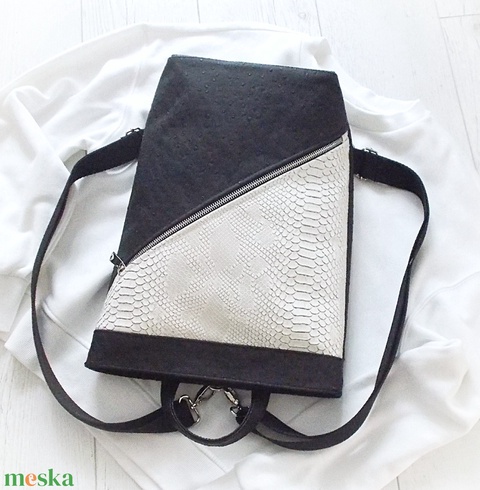 - Anyaga: cippzár, kígyóbőr mintás műbőr, műbőr, pamut vászon, karabiner