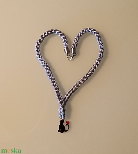 - Anyaga: szatén horgoló, végszerelékek, fekete cica, sziv, delfinkapocs