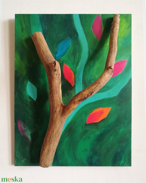 - Anyaga: akrilfestmény, rétegelt lemez, faág