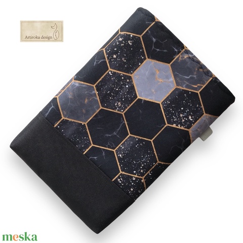 Bélelt könyvtok, vízálló textilből, méhsejt mintával fekete színben leheletnyi arannyal fűszerezve - Artiroka design