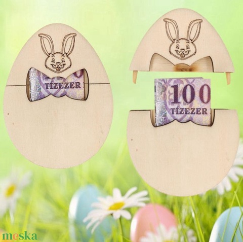 Add át stílusosan a pénzt Húsvétkor! Ez a gravírozott fa pénzátadó tojás amellett, hogy szép és ötletes, egy maradandó emlék is lesz egyben a húsvéti megajándékozottnak. A fa tojás 3 rétegű, ami lehetővé teszi, hogy a középső részbe bele lehessen csúsztatni papírpénzt.