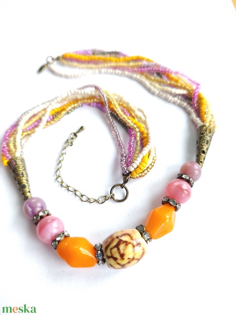 8 soros rózsaszín és narancssárga tarka gyöngy nyaklánc - kézzel festett kerámia gyönggyel a közepén