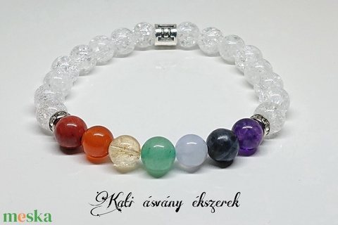 Ásvány neve, mérete: vörös jáspis, karneol, citrin, aventurin, kalcedon, szodalit, ametiszt 1-1 db. 8 mm-es, repesztett hegyikristály 16 db. 8 mm-es.