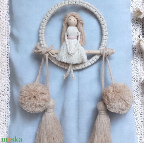 Natúr makramé falidísz ekrü és bézs színekben – makramé baba karikán, bojtokkal és pompommal
