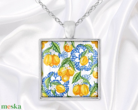 Mediterrán hangulatú, négyzet alakú üveglencsés medál szicíliai citromokkal