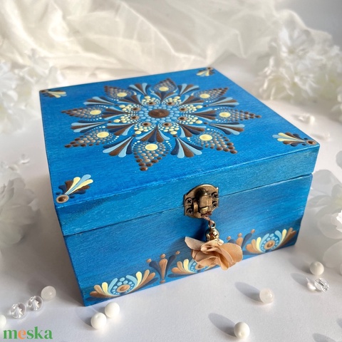 Mandala mintával festett kék fadoboz - teásdoboz - teafiltertartó