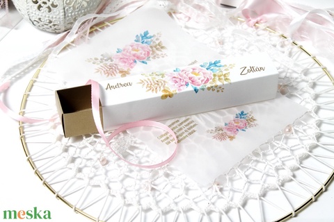 Különleges esküvői meghívó, mely két részből áll: egy kihúzható dobozból, melyet egy nagyon szép watercolor motívum díszít és egy pausz papírból készült tekercsből. A tekercsen is a virág motívum látható a meghívó szöveges tartalmával együtt.