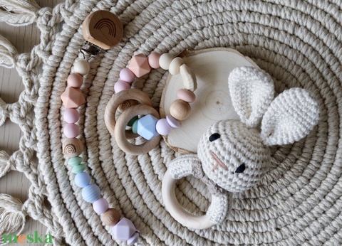 Egyedi, minőségi cumilánc és marokrágcsa szett, horgolt nyuszival, díszdobozban.