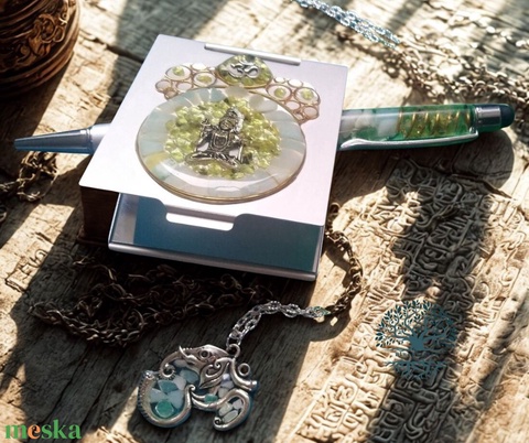 Orgonit alumínium tükör Buddhával, Aum szimbólummal, a nyakláncon elefánt formázta Aum medál, a golyóstoll felső részében rézzel, amazonit és olivin ásványokkal.