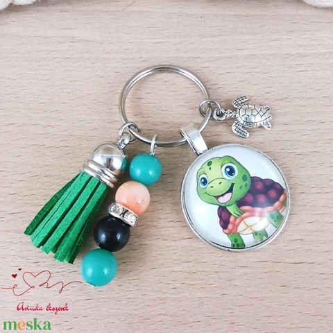 Teknősbéka zöld bojtos üveglencsés kulcstartó táskadísz