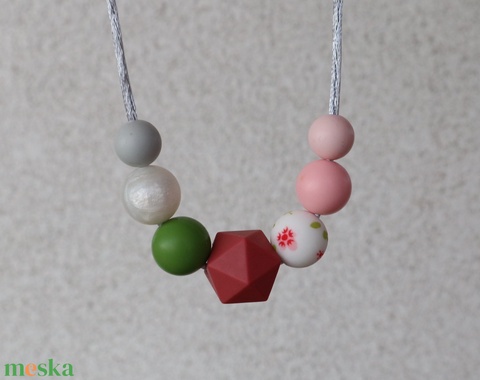 szilikon gyöngy, szatén zsinór, műanyag csat