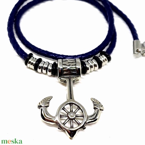 Vasmacska sötétkék férfi bőr nyaklánc nemesacél horgony medállal