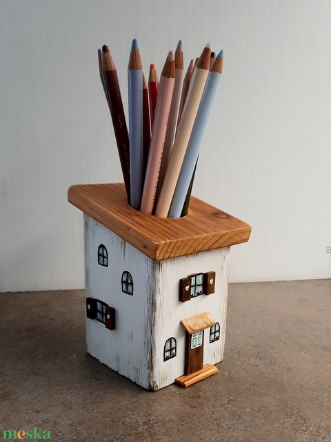 Fából készült házikó ceruzatartó. Letisztult formájának köszönhetően bármilyen stílusú íróasztalhoz illeszkedik és vidám, kedves hangulatú díszévé válik. Remek egyedi ajándék gyerekeknek, felnőtteknek egyaránt!