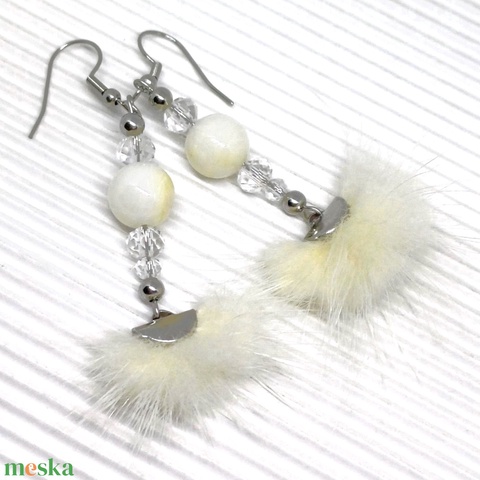 Selymes nyuszi törtfehérben - szőrmés lógós fülbevaló kagylógyönggyel, nemesacél
