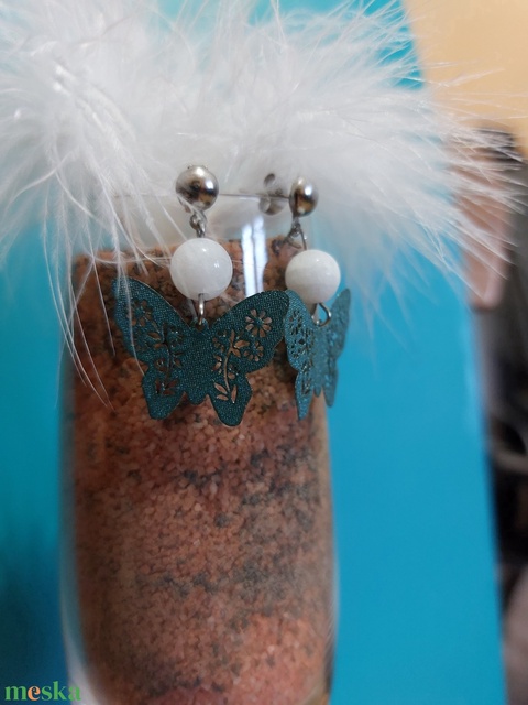 nemesacél szerelvények, tejkvarc ásványgyöngy, kék fém pillangó