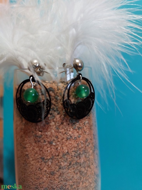nemesacél szerelvények, fekete fém dísz, zöld achát ásványgyöngy