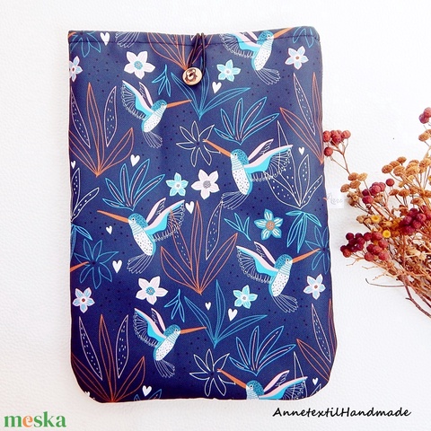 Könyvtok, tablettok, sötétkék, kolibris, vízhatlan