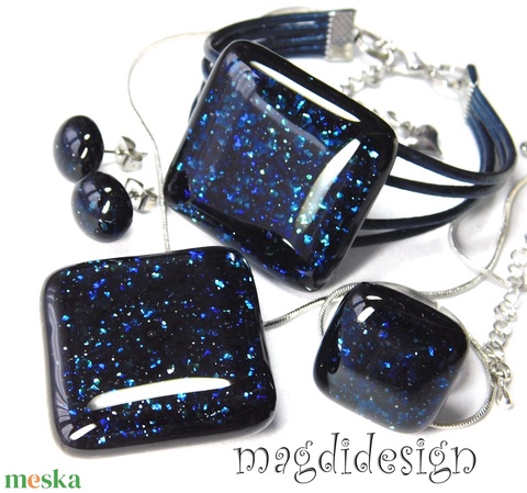 EREDETI Kék aventurin csillogás üvegékszer szett, rombusz nyaklánc, karkötő, gyűrű, stiftes fülbevaló