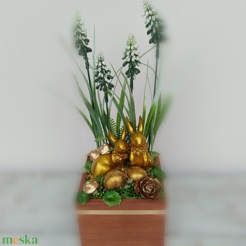 - Anyaga: fa alap, polyresin figura, műanyag tojás, gumi és műanyag növények