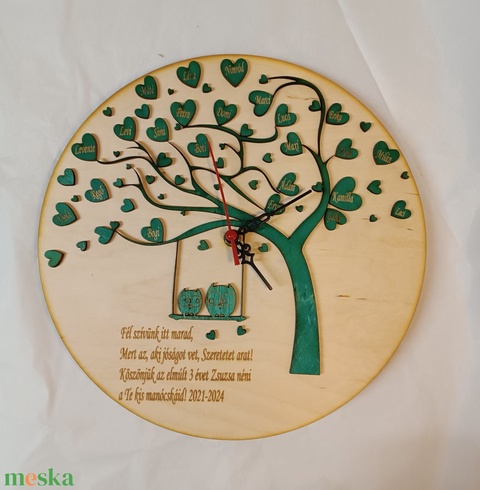 Ballagási baglyos falióra Pedagógusoknak, Óvó néniknek, Dadusoknak zöld fa
