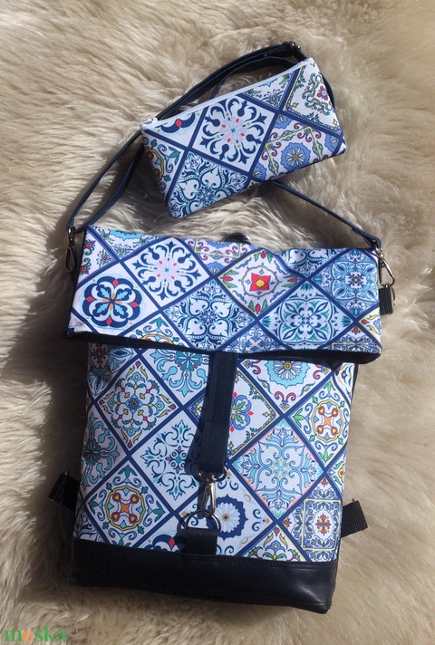 Kék mintás vízálló átalakítható válltáska/hátizsák - valódi bőrrel + neszivel
