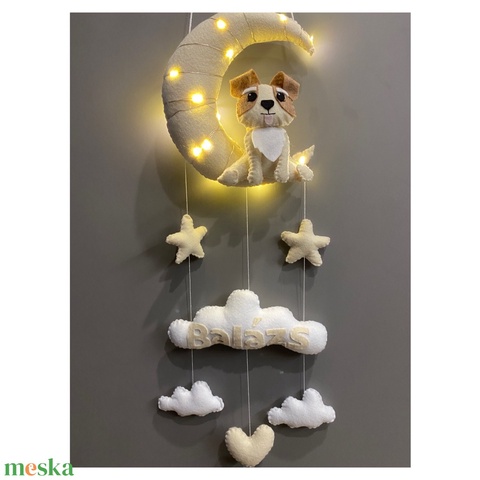 Világító névre szóló éjszakai fény, babaszoba dísz, babaköszöntő/babaváró ajándék, foltos kutyussal, világító holdal