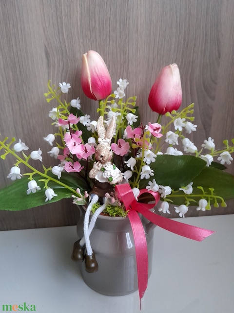 Tavaszi asztal dekoráció lábát lógató nyuszival tulipánnal és gyöngyvirággal.