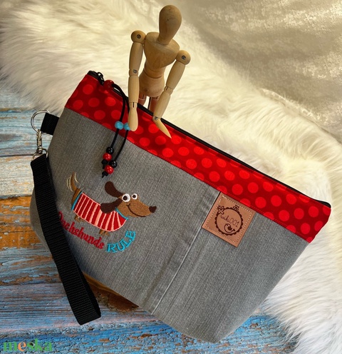 Hímzett Tacsi mintás farmer és vászon neszesszer, csukló táska