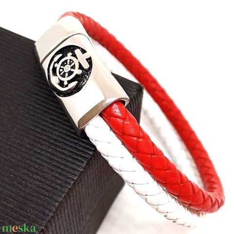 Tengerész piros-fehér valódi bőr karkötő, horgony mintás, nemesacél mágneszárral, nőknek