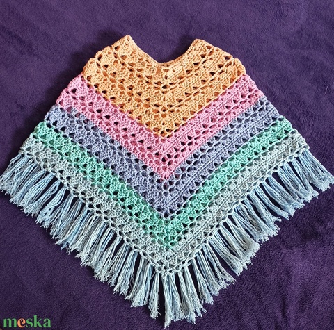 Pasztell színű, koptatott hatású, pamut-akril fonalból horgolt gyerek poncsó