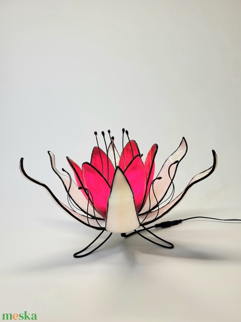 A szirmokat fél transzparens piros üvegből a leveleket krémszínű opálüvegből hajlítottuk a megfelelő formára kemencében és tiffany technikával építettük össze. Led világítással szereltük.