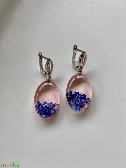 Nefelejcsek halvány rózsaszín háttérrel-ovál műgyanta,ezüst fülbevaló