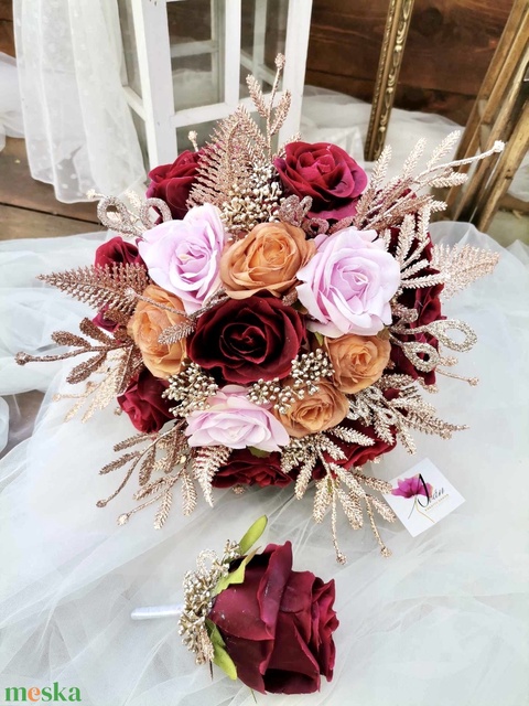 Rosegold, bordó Menyasszonyi csokor örök, csokor örökcsokor szett, esküvői virág, örökvirág