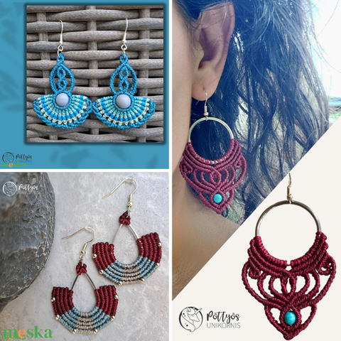 Többféle mikromakramé fülbevaló - Türkiz/Bordó/Kékes-Bordó ívelt választható variációkban