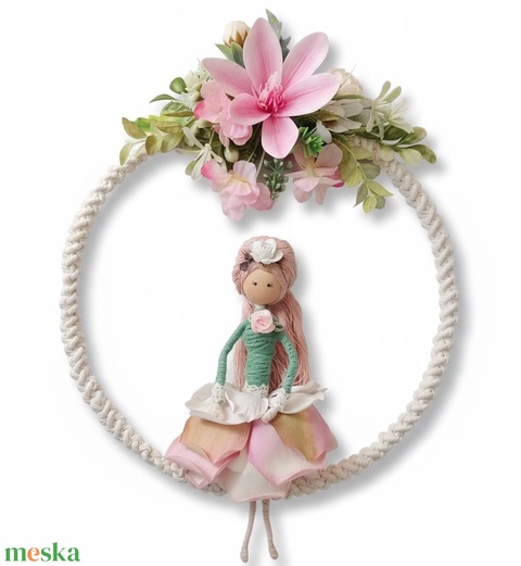 - Anyaga: makramé fonal, selyemvirág, fa golyó, fém karika